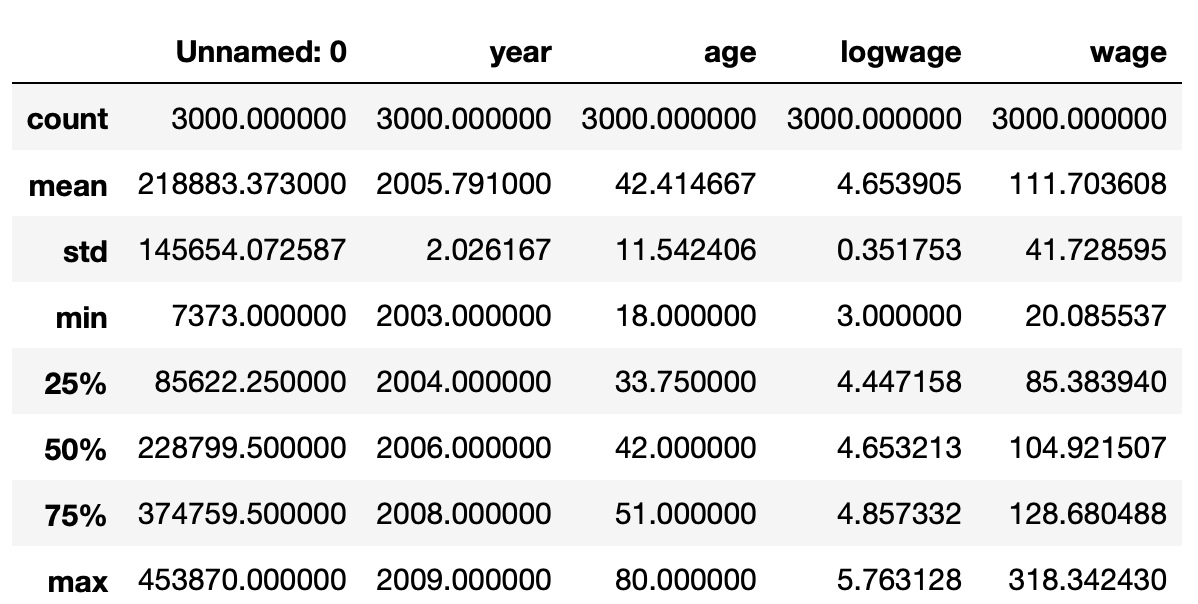 간단한 한 줄의 Python 코드로 하단의 테이블과 같은 결과를 체크하여 데이터의 특성을 파악할 수 있는데, 데이터 셋에 포함된 레코드 수, 각 숫자로 이루어진 컬럼(Column)의 통계변수 등을 한 눈에 살펴 볼 수 있다. 이 데이터 셋의 경우 3천개의 행으로 이루어져 있으며, 조사 대상 집단의 나이는 평균 42.41세, 최저 18세 ~ 최고 80세까지로 구성되어 있다. 또, 평균 임금은 $111 정도이며 최저 임금은 $20.8 이다. 이렇게 간단하게 데이터 특성을 상당 부분 파악할 수 있지만, 그래도 읽는데는 시간이 걸리고 특히 한 눈에 들어오지는 않는다.