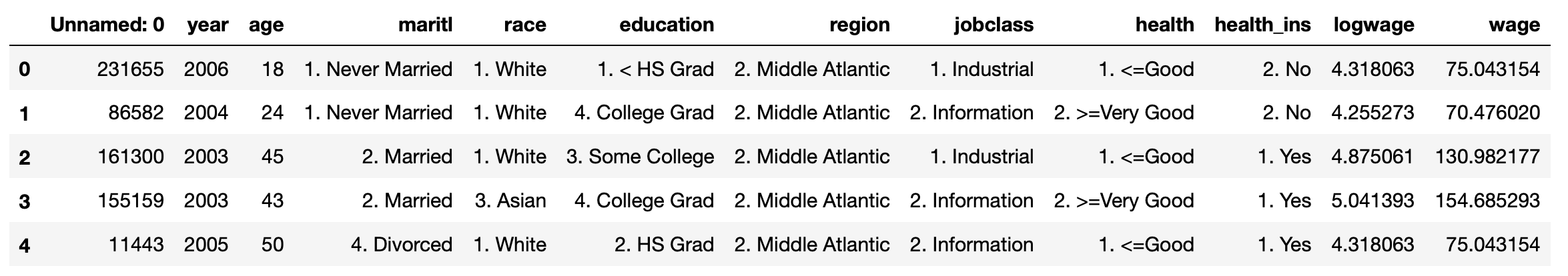실제 사례로 다음 미국 동부지역의 임금(wage)를 조사한 자료를 살펴보자. 원시 데이터는 ..csv 형태의 텍스트 파일인데, 데이터사이언스 분야에서 가장 많이 사용되고 있는 프로그래밍 언어인 Python의 Pandas 라는 데이터 관리 라이브러리를 통하면 간단하게 .csv 파일에서 데이터를 읽어서 테이블 형태로 변환하고 데이터분석을 준비하는 단계를 완료할 수 있다.