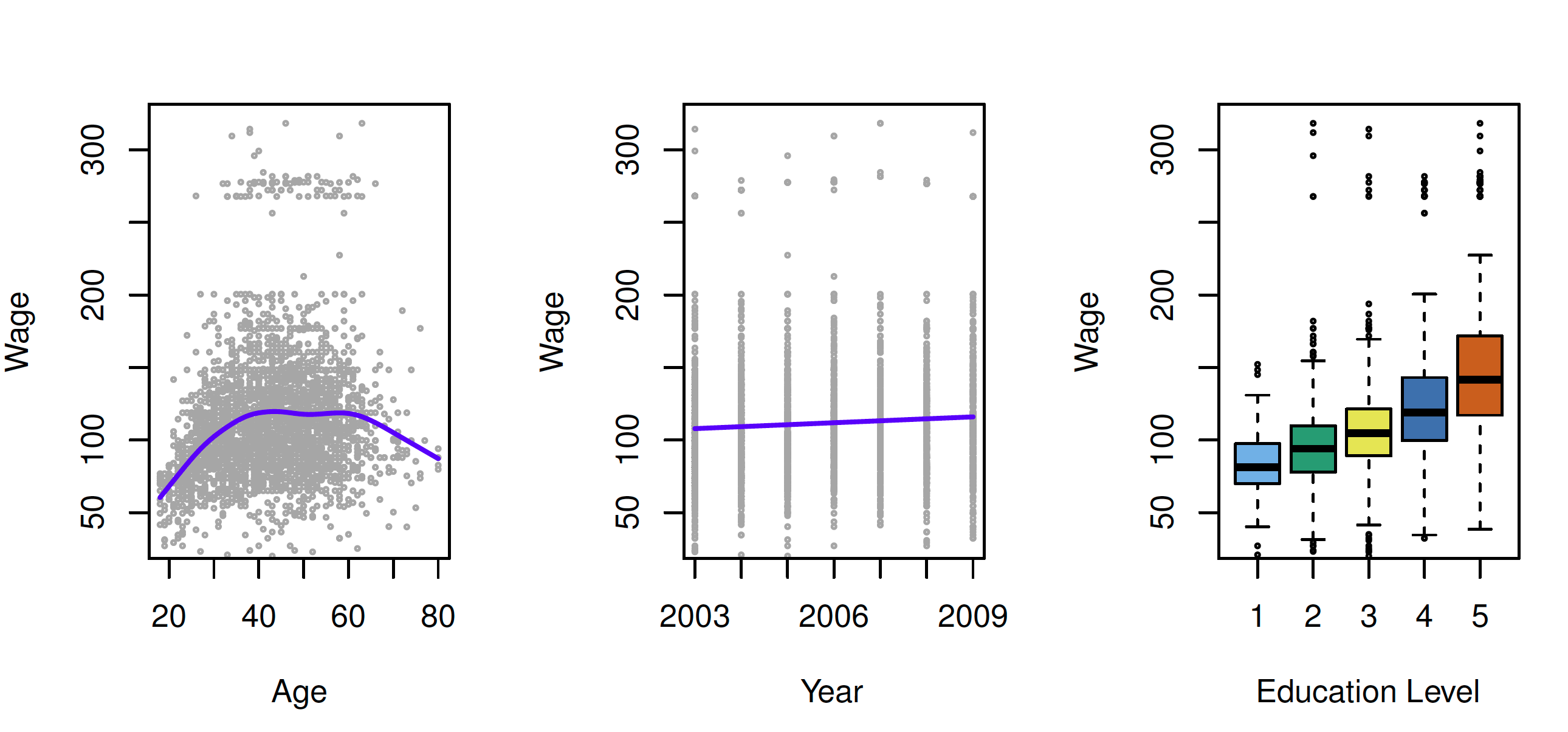 하지만, 그래프를 사용하면 이야기가 조금 달라진다. 다음 세 가지 그래프를 살펴보면 데이터에 포함된 조사 결과를 보다 한 눈에 많은 내용을 확인할 수 있다. 첫 번째 그래프를 통해서는 연령별 최저, 최고 임금을 확인 할 수 있으며, 두번째 그래프에서는 년도별 변화를 세번째 그래프에서는 학력과 임금과의 관계를 쉽게 이해할 수 있으며, 데이터에 담겨진 스토리를 한 눈에 읽어 낼 수 있다. Python으로 이러한 차트는 그리 어렵지 않게 만들 수 있다.